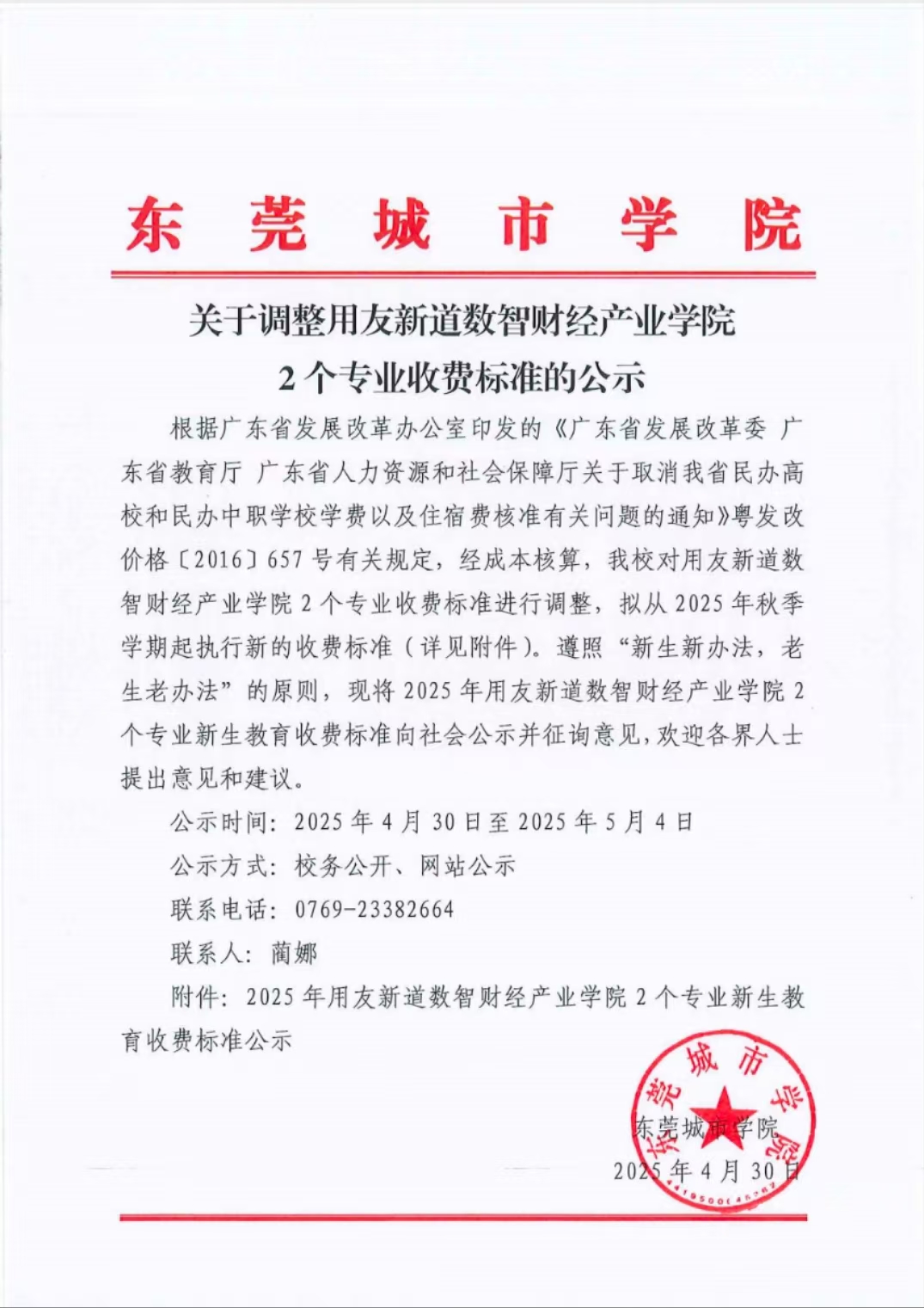 关于调整用友新道数智财经产业学院2个专业收费标准的公示