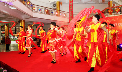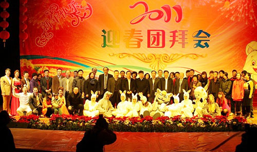 领导嘉宾与演员们合影留念领导和嘉宾祝酒 晚宴董事长、鸿发集团总裁麦照容为团拜会抽奖 国家一级演员于乃久与江燕副教授对唱《为了谁》 总务处员工舞蹈《我们来自五湖四海》 1月14日,城市学院2011迎春团拜会在大礼堂隆重举行