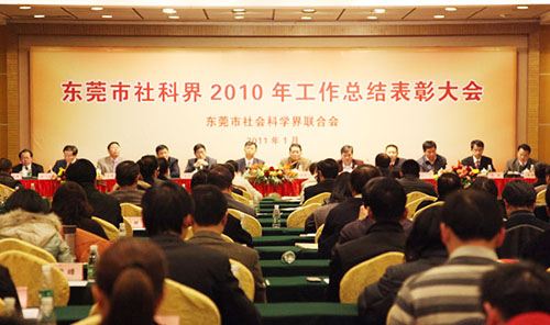 东莞市社会科学界2010年工作总结表彰大会1月6日在东莞会展国际酒店举行。广东省社科联朱新行副书记、省社科院温宪元副院长,中共东莞市委常委、宣传部部长王道平,副市长严小康,东莞市社科联主席王思煜、副主席龙家玘等省