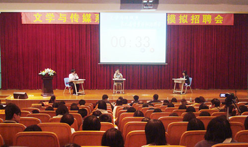 为了让大学生在日益严峻的大学生就业形势、日趋激烈的人才市场竞争中能找准自己的职业定位,增强就业信心,提高应聘技巧,11月20日,文学与传媒系在学术报告厅隆重举行第二届情景模拟招聘会。 模拟招聘会分为三个环节,15