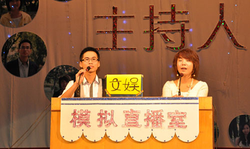11月22日,我院第五届校园主持人大赛决赛在学院大礼堂举行,学院党委副书记朱冰、学生处处长章德胜、就业办主任江小卫、院团委书记杜鹏举等观看了比赛。 来自各个系部的14名选手参加了角逐。比赛分“模拟直播间”和“主
