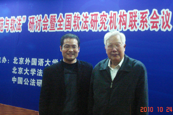 吴春庚老师与罗豪才教授合影留念 10月24日,“协商民主规范与软法”研讨会暨全国软法研究机构联系会议在北京外国语大学召开。我院管理系吴春庚老师应邀参加研讨会。 我国行政法学界泰斗、原全国政协副主席罗豪才教授莅临会议并致辞