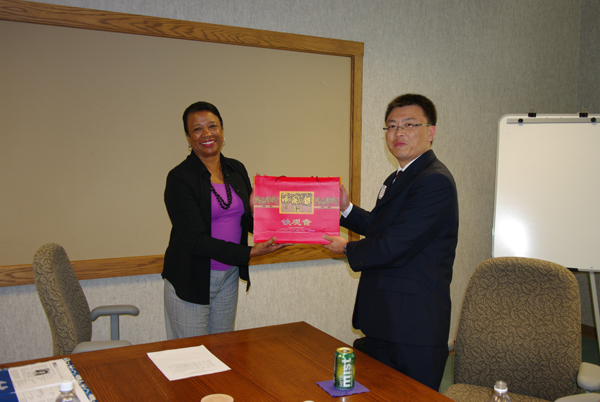 校长Alan教授和副校长Gloria Gibson博士接见我院访问团成员 副校长Gloria Gibson博士与访问团成员合影 访问团与北爱荷华大学有关部门负责人座谈 访问团参观北爱荷华大学图书馆 访问团向北爱荷华大学赠送礼品 7月25日,在图书信息中心主任
