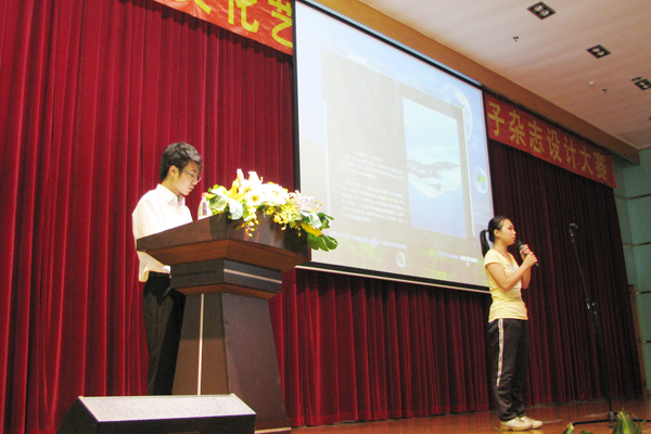 由院团委主、计算机与信息科学系承办的“第一届电子杂志设计”大赛于6月3日在学术报告厅举行。 入围决赛的14支队伍分别展示了自己精彩的设计作品。经过激烈的角逐,计信系“我爱我家”小组的《壮乡风情》和“晨风曦雨”小组的《设