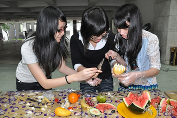 4月29日,由我院院学生会主办、院女生部承办的“水果拼盘创作大赛”在四号楼大厅举行。虽然外面大雨倾盆,但女生们的参赛热情仍然很高,她们冒雨准时参赛,表示绝不放弃这个展示自己厨艺刀功的机会。 此次大赛共有35个参赛小组。