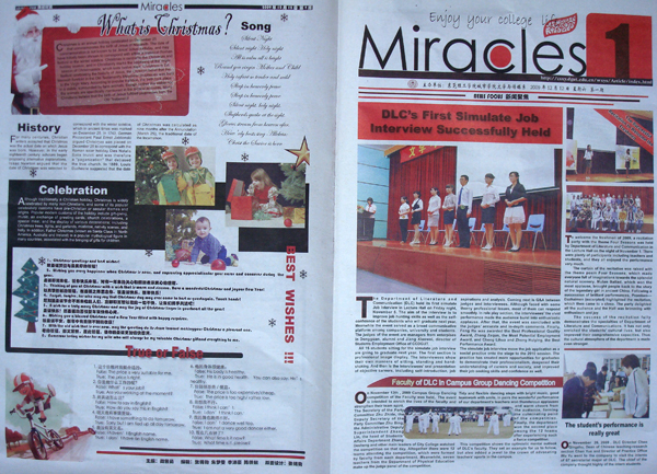 为了提高同学们对英语学习和英语国家文化的兴趣,给同学们提供一个充分展示自己英语才能的平台。文传系近日出版了第一期名为《Miracles》的英语报,这也是我院首次出版的英语类报纸。 英语报取名为“Miracles”,其英文释义为“奇迹,