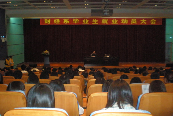 12月8日,财经系在学术报告厅召开学生就业动员大会,邀请东视广告公司总经理杨志成介绍就业体会。 杨志成总经理向同学们讲述了自己的创业历程,并以自己公司为例,分析社会人才需求信息。他认为,当今社会很需要工作踏实、有创新