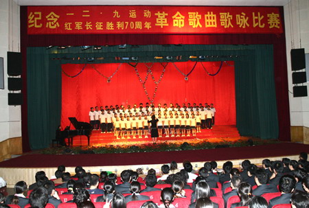 为了纪念一二•九运动暨红军长征胜利70周年,激发广大师生的爱国热情,12月7日,我院在大礼堂隆重举行“纪念一二•九运动暨红军长征胜利70周年革命歌曲歌咏比赛”。党委副书记朱冰担任顾问,学生处处长章德胜副教授、团委