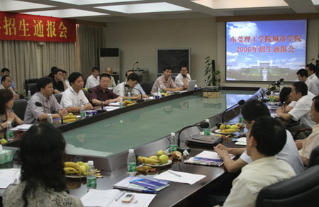 5月9日,东莞理工学院城市学院在315会议室召开2006年招生情况通报会。东莞市教育局考试中心负责同志和来自东莞市各镇区的40多所中学的校长、教导主任共80余人出席会议。 会议由城市学院党委副书记朱冰同志主持。城市学院常务副