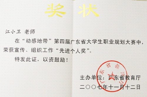 11月12日,广东省第四届大学生职业规划大赛组委会传来喜讯,我院财经系学生林智聪荣获本科组“特别激励奖”,学院就业指导办公室获“最佳组织奖”,就业指导办公室副主任江小卫老师获宣传、组织工作“先进个人奖”。