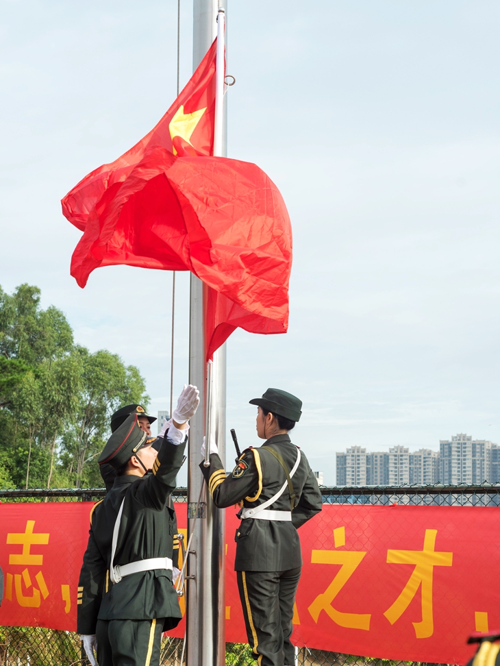8时15分,学校国旗护卫队队员迈着整齐、昂扬的步伐,通过主席台来到旗杆下,在庄严的国歌声中,将鲜艳的五星红旗冉冉升起。全体师生向国旗行注目礼,表达了对祖国无限的热爱和崇高的敬意。