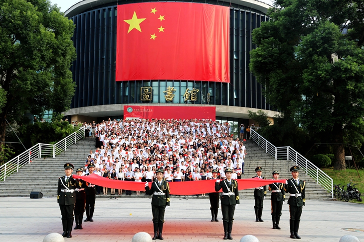 下午16时,从图书馆小广场到映月湖桥上,延伸至秋枫广场,国旗飘扬,二级学院几千名学生组成的10个方阵身着红色衣衫,整齐排列,连成了一片红色的海洋。
