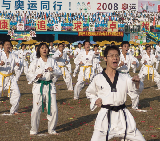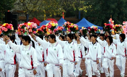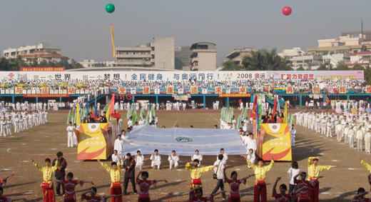 开幕式上鸣放了礼炮,进行了健美操、武术、太极剑和跆拳道精彩的表演,又一次将运动会推向高潮。舞动太极剑的女中豪杰英姿勃发,气宇轩昂;跆拳道的一招一式刚柔并济,展示着力与美的完美结合;156个女生组成的伞操表演五彩斑斓,风姿卓越;花车传出的悠扬歌声,饱含着师生对学院运动会和北京奥运会的深深祝福。
