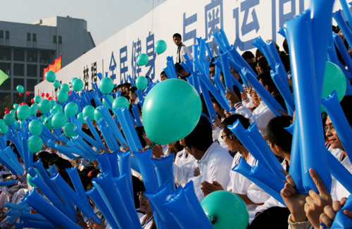 彩旗、气球、红色标语牌把运动场装扮得庄重热烈。运动场内外,人潮涌动,“白帆”点点,掌声、助威呐喊声此起彼伏,处处显现出和谐、青春、激烈的运动气息。