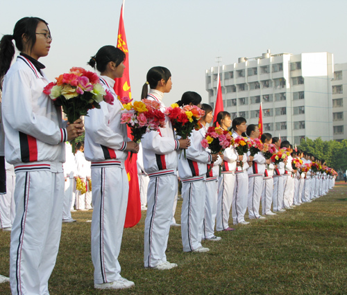 在雄壮的运动员进行曲伴奏下,国旗护卫队、鲜花队、彩旗队、院旗队、裁判员队以及各系代表队、教工队依次经过主席台。特别引人注目的是,各系运动员们不时地挥动着手中各具特色的道具,喊着雄壮有力的口号,为运动会增添了一道道亮丽的风景线,博得了与会人员热烈的掌声。