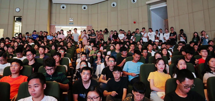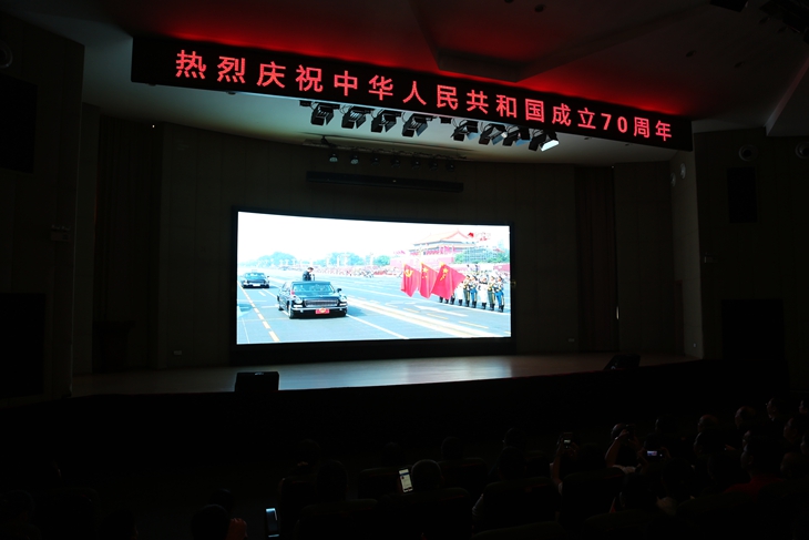 报告厅座无虚席,许多没有座位的学生坐在走道上,甚至站在会场边观看直播。每到激动人心的时刻,师生们都由心而发地响起阵阵热烈的掌声,为祖国欢呼喝彩!