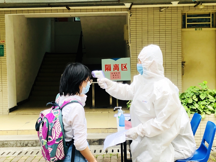此次新冠肺炎疫情应急处置演练分为两项,模拟疫区学生返校、突发异常情况等场景下,进行发现疫情、上报信息、隔离观察、及时送诊、消毒警戒等应急处置工作的过程。