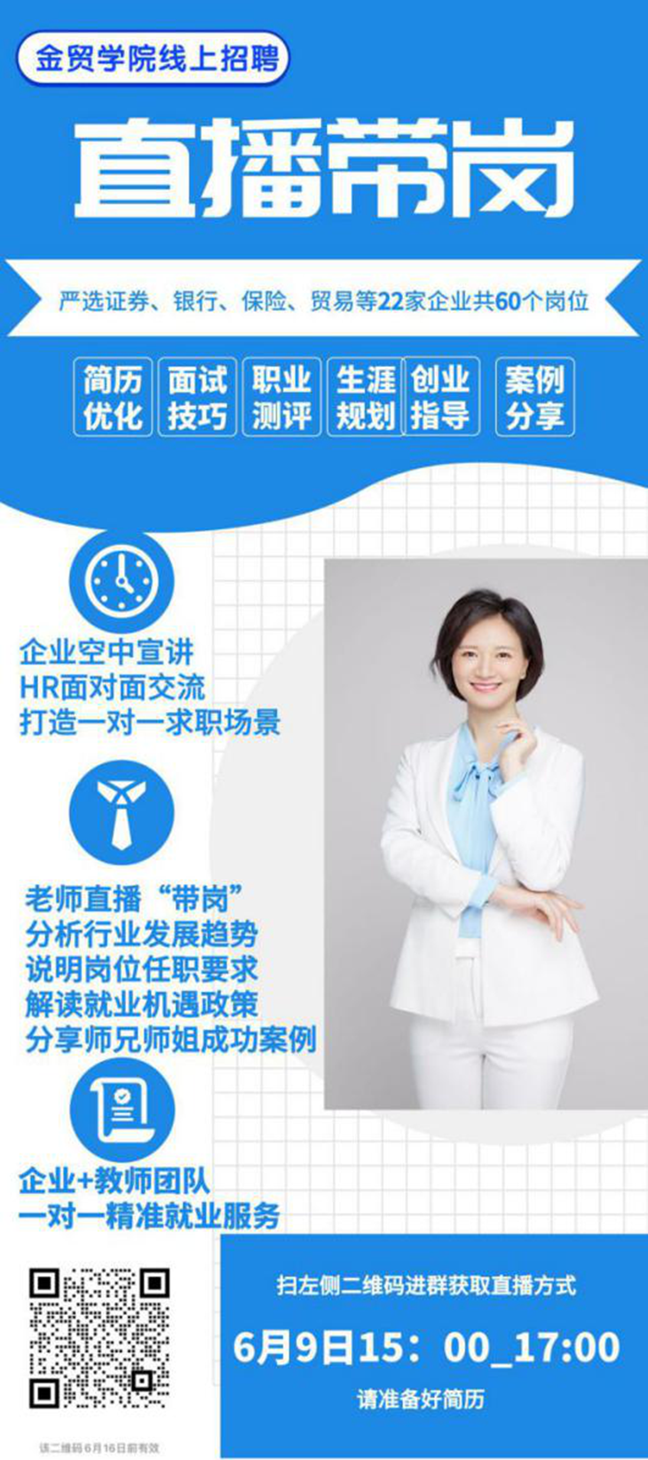 6月9日下午,第一场带岗直播在腾讯会议线上平台进行,由金贸学院党总支副书记万文双线上带“岗”,筛选出证券、银行、保险、贸易等22家企业共60多个岗位供毕业生们选择。