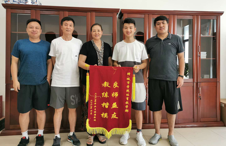 7月2日张潘同学返回学院,为体育教学部领导和老师送来致谢锦旗,感谢四年来体育教学部领导的悉心关照,教练员的精心栽培。