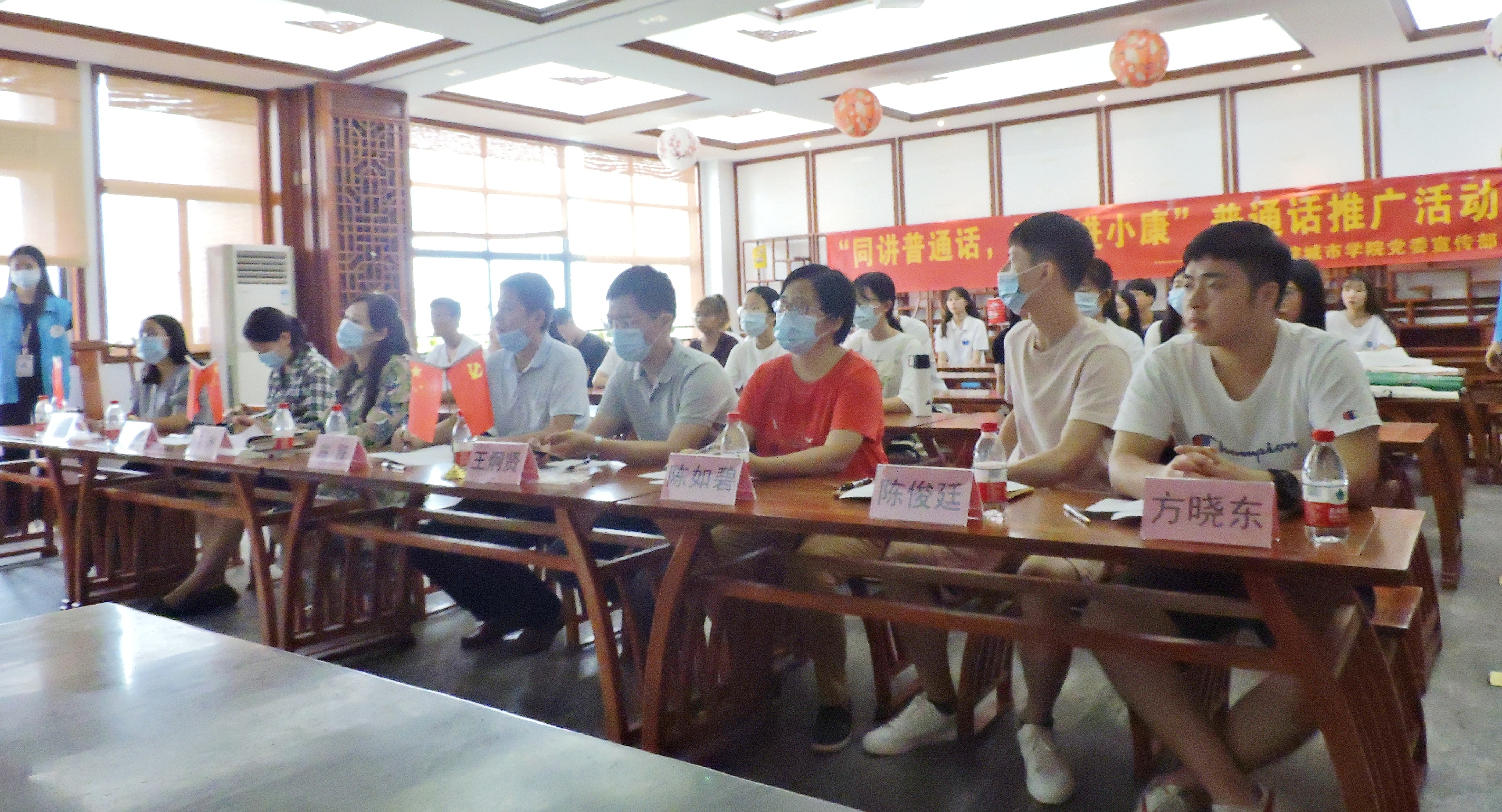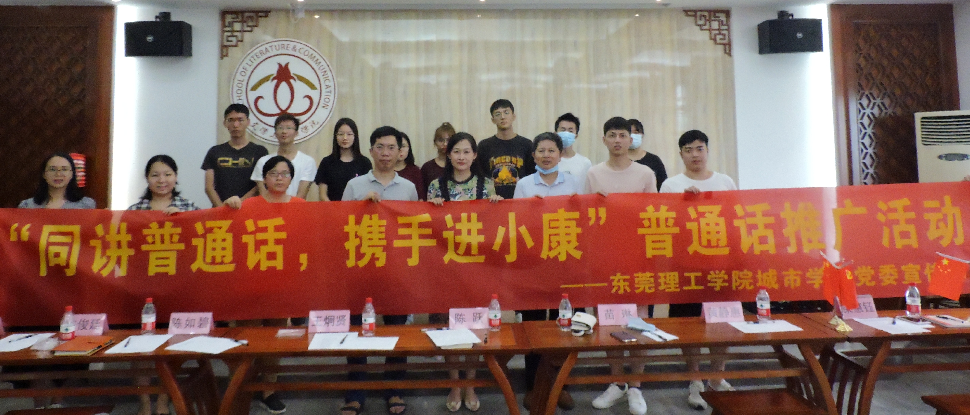 为提高同学们的普通话水平,贯彻落实国家“大力推广,积极普及,逐步提高”的方针,Beat365党委宣传部于2020年9月18日在文学与传媒学院国学馆开展“同讲普通话,携手进小康”普通话推广活动。校宣传部副部长、融媒体中心主任苗琳,文学与传媒学院党总支书记、副院长陈跃,党总支副书记王炯贤,陈如碧博士,辅导员黄静惠、陈俊廷、方晓东、梁慧钰以及各学生代表参加了本次活动。