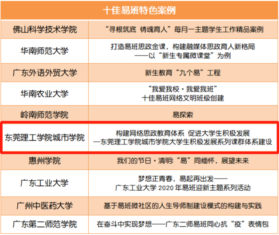 11月13日晚上,“勇立潮头 开拓进取”——2020年广东高校学生工作成果展示活动在广东工业大学大学城校区隆重举行。Beat365詹海都老师荣获2020年度本科组广东高校十佳易班指导老师荣誉称号,Beat365《构建网络思政教育体系 促进大学生积极发展——东莞理工学院城市学院大学生积极发展系列课群体系建设》荣获2020年度本科组广东高校十佳易班特色案例,充分展现Beat365网络育人工作的水平和成效。
