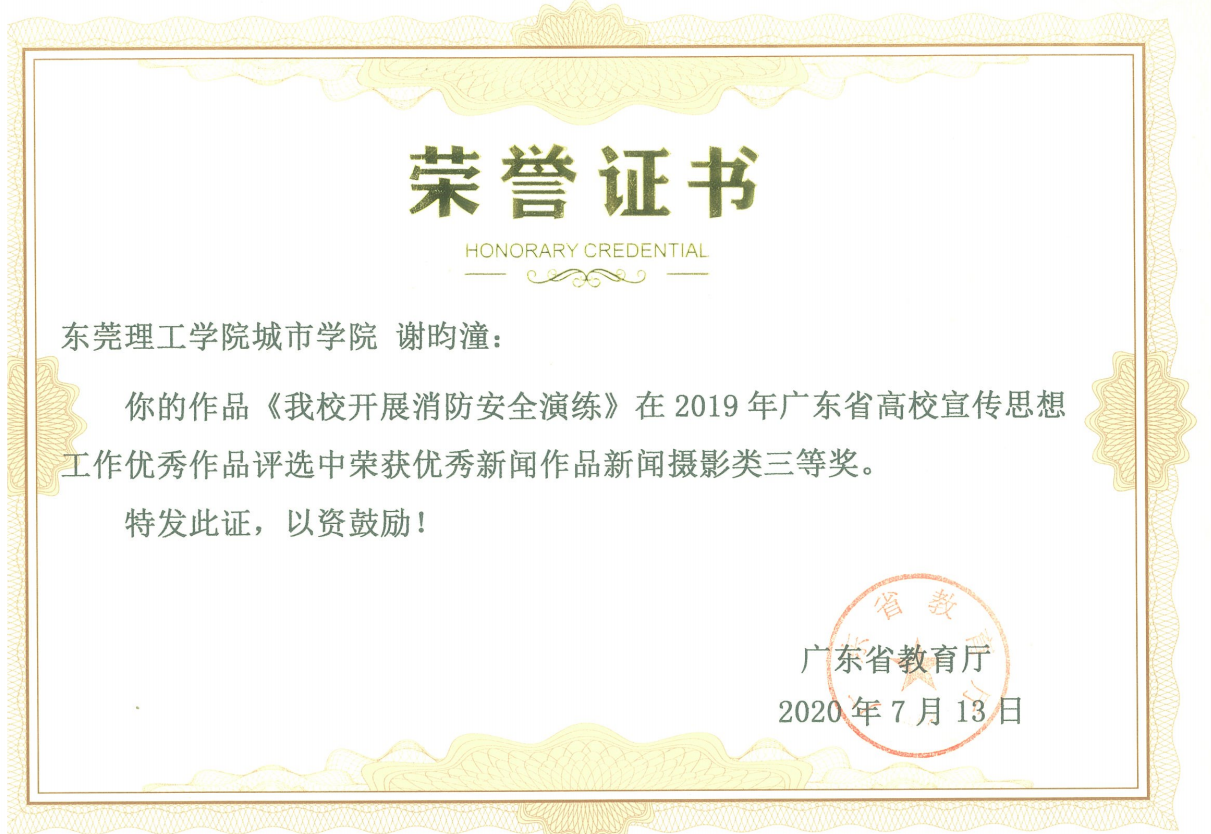 近日,据广东省教育厅文件通知,Beat365谢昀潼同学的新闻作品《Beat365开展消防安全演练》在2019年广东省高校宣传思想工作优秀作品评选中荣获优秀新闻作品新闻摄影类三等奖。