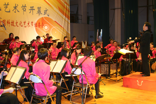 开幕式晚会上,广州民族乐团为我院师生员工献上了一台丰富的艺术盛宴。一年之计在于春,大合奏《新春锣鼓》拉开了晚会的序幕,也开启了春天的希望。激昂而又婉转的男声独唱《家和万事兴》,表现了人们呼唤和谐的心声,引起了大家的共鸣。西部音乐联奏把晚会推向高潮,它将《马车夫舞曲》、《在那遥远的地方》、《掀起你的盖头来》、《青春舞曲》等4首西部乐曲汇编成一首欢乐、抒情的优美旋律,让人憧憬西部秀美的景色和大好河山。曾获得中央电视台1998年全国青年歌手大奖赛一等奖的总政歌舞团著名演员于乃久,用高亢激昂的《当兵的人》,将晚会又一次推向高潮。最后,晚会在轻快欢愉的大合奏《步步高》中落下帷幕。