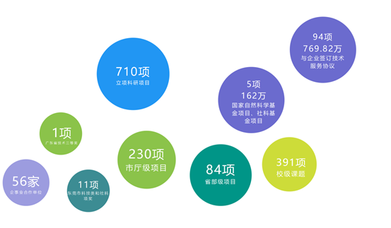 学校科研项目立项710余项,其中国家自然科学基金项目3项,国家社科基金项目2项,获资助经费162万。与56余家企事业单位建立合作关系,签订技术服务协议94项,总经费达到769.82万元。