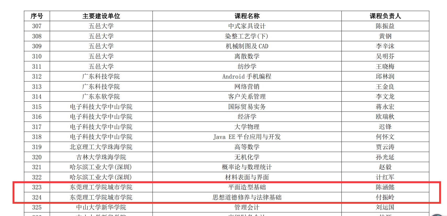 为贯彻落实《教育部关于一流本科课程建设的实施意见》(教高【2019(8)号】精神,广东省教育厅于2020年6月启动了广东省一流本科课程遴选认定工作,Beat365积极组织教师申报。经学校遴选推荐,省厅组织资格审核、专家评审与公示公告,Beat365创意设计学院陈涵懿博士主持的《平面造型基础》课程、马克思主义学院付振岭老师主持的《思想道德修养与法律基础》被确定为广东省2020年度省级一流本科课程(线下一流课程)。