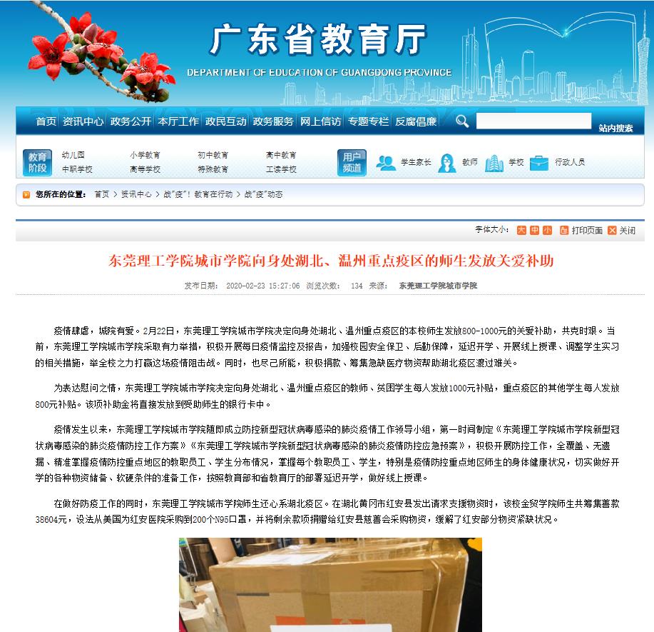 2月22日,东莞理工学院城市学院决定向身处湖北、温州重点疫区的本校师生发放800-1000元的关爱补助,共克时艰。学校举全校之力打赢这场疫情阻击战。同时,也尽己所能,积极捐款、筹集急缺医疗物资帮助湖北疫区渡过难关。
