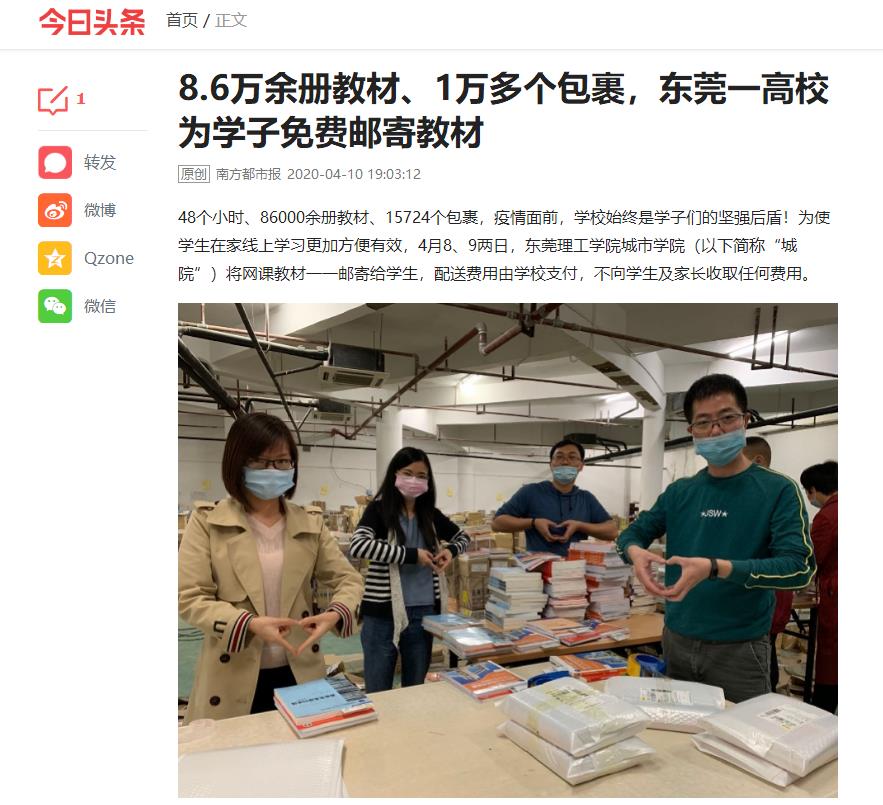 深入贯彻落实教育部“停课不停教、停课不停学”的要求,东莞理工学院城市学院决定为同学们免费寄送新学期教材。在短短2天内,将总数达86000余册的教材打包邮寄, 所有教材配送费用由学校支付,不向学生及家长收取任何费用。
