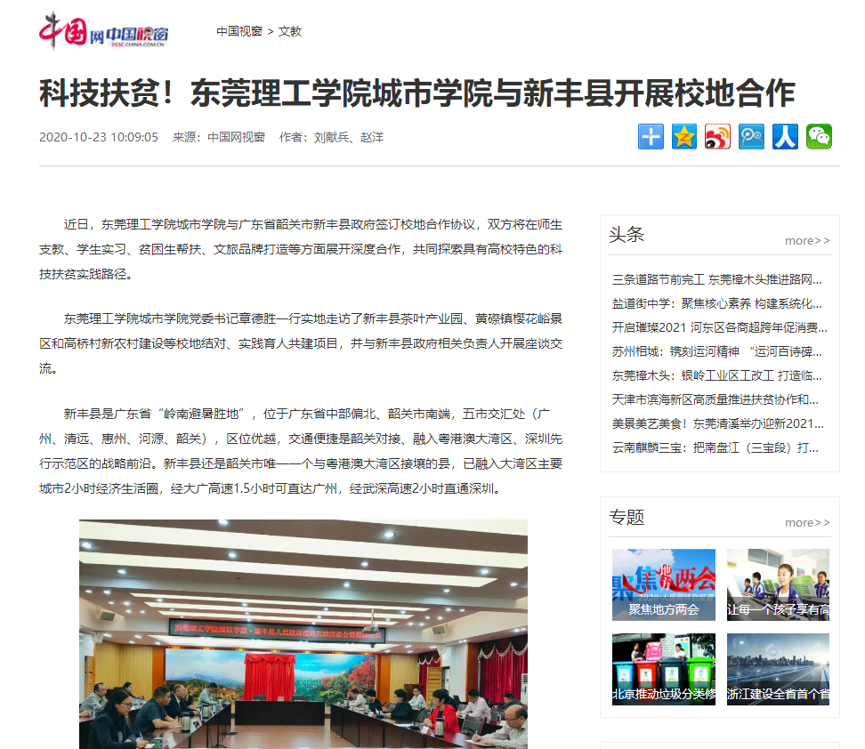 东莞理工学院城市学院与广东省韶关市新丰县政府签订校地合作协议,双方将在师生支教、学生实习、贫困生帮扶、文旅品牌打造等方面展开深度合作,共同探索具有高校特色的科技扶贫实践路径。