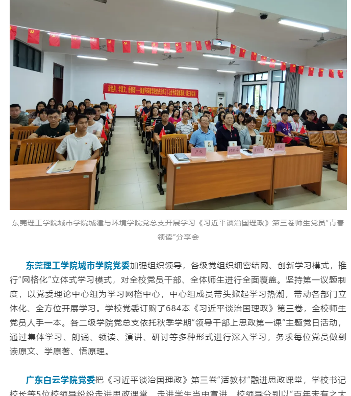 东莞理工学院城市学院党委加强组织领导,各级党组织细密结网、创新学习模式,推行“网格化”立体式学习模式,对全校党员干部、全体师生进行全面覆盖。坚持第一议题制度,以党委理论中心组为学习网格中心,中心组成员带头掀起学习热潮,带动各部门立体化、全方位开展学习。