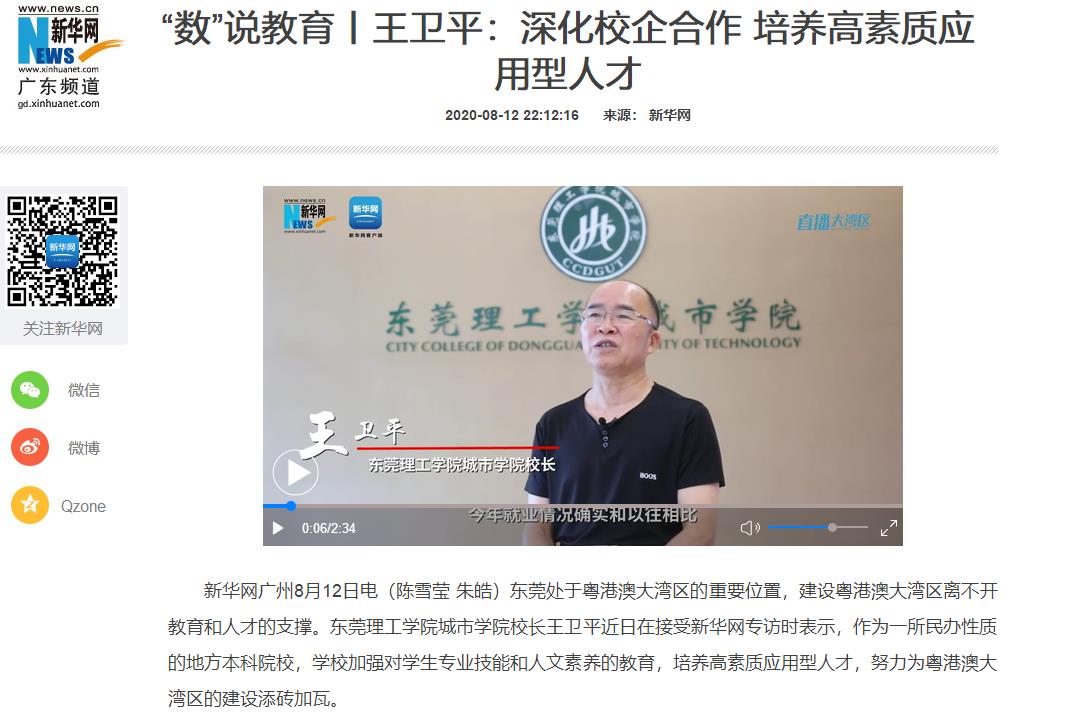8月12日,东莞理工学院城市学院校长王卫平近日在接受新华网专访时表示,作为一所民办性质的地方本科院校,学校加强对学生专业技能和人文素养的教育,培养高素质应用型人才,努力为粤港澳大湾区的建设添砖加瓦。