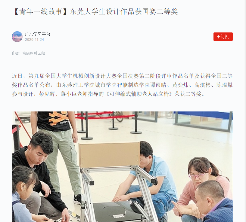 第九届全国大学生机械创新设计大赛全国决赛第二阶段评审作品名单及获得全国二等奖作品名单公布,由东莞理工学院城市学院智能制造学院谭雨晴、黄奕炜、高淇彬、陈琨胤参与设计,彭见辉、黎小巨老师指导的《可伸缩式辅助老人站立椅》荣获二等奖。