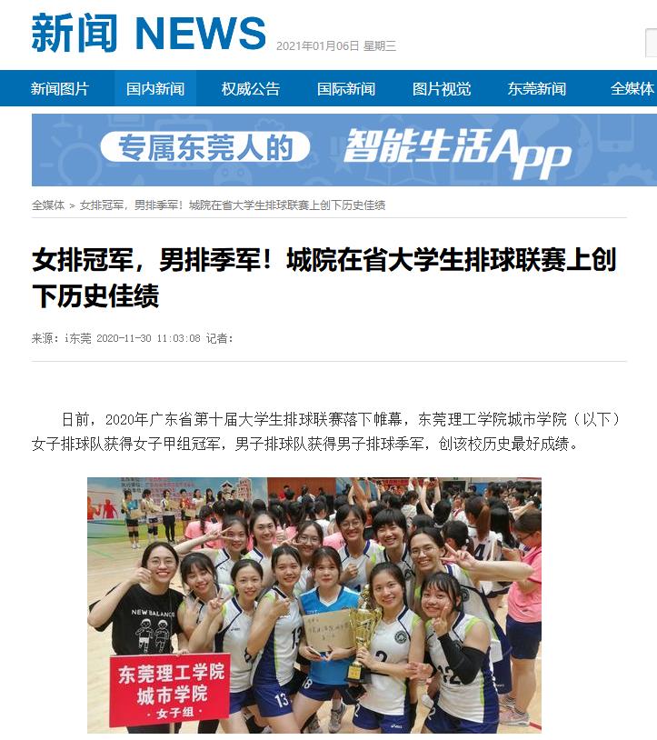 11月22日,由广东省教育厅主办、广东省排球协会和开平市文化广电旅游体育局承办的2020年广东省第十届大学生排球联赛(甲组),在开平市体育中心落幕。东莞理工学院城市学院组队参加男、女子组的比拼,最终城院女排斩获甲B组冠军、城院男排获得甲B组季军。