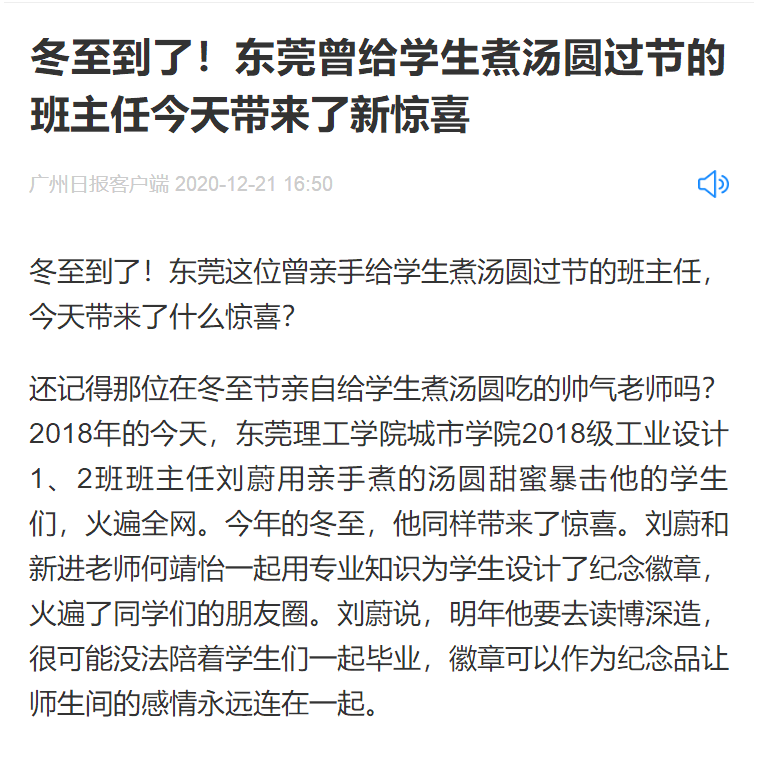 2018年的今天,东莞理工学院城市学院2018级工业设计1、2班班主任刘蔚用亲手煮的汤圆甜蜜暴击他的学生们,火遍全网。今年的冬至,他同样带来了惊喜。刘蔚和新进老师何靖怡一起用专业知识为学生设计了纪念徽章,火遍了同学们的朋友圈。