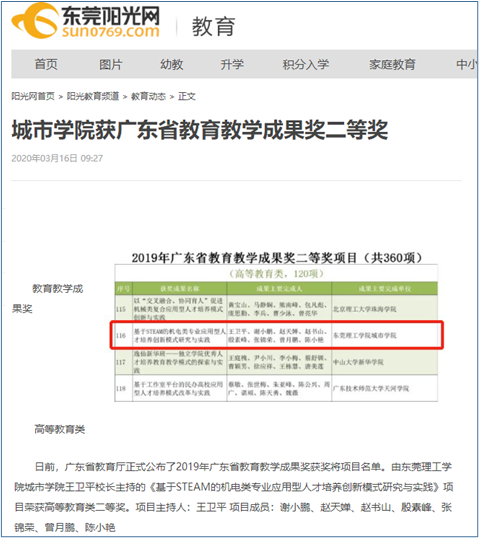 广东省教育厅正式公布了2019年广东省教育教学成果奖获奖将项目名单。由东莞理工学院城市学院王卫平校长主持的《基于STEAM的机电类专业应用型人才培养创新模式研究与实践》项目荣获高等教育类二等奖。