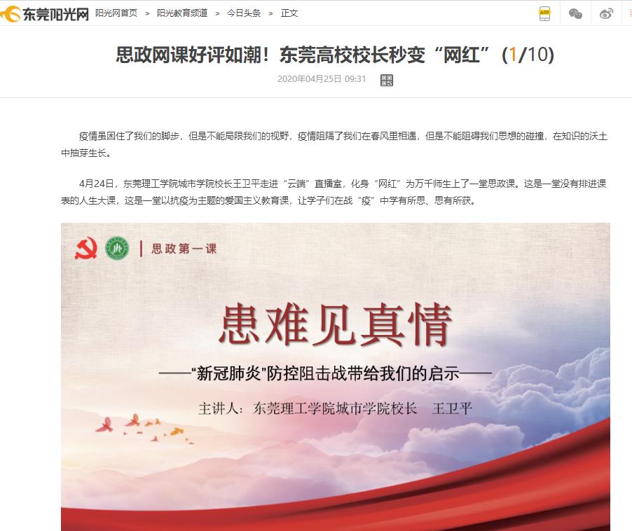 4月24日,东莞理工学院城市学院校长王卫平走进“云端”直播室,化身“网红”为万千师生上了一堂思政课。这是一堂没有排进课表的人生大课,这是一堂以抗疫为主题的爱国主义教育课,让学子们在战“疫”中学有所思、思有所获。