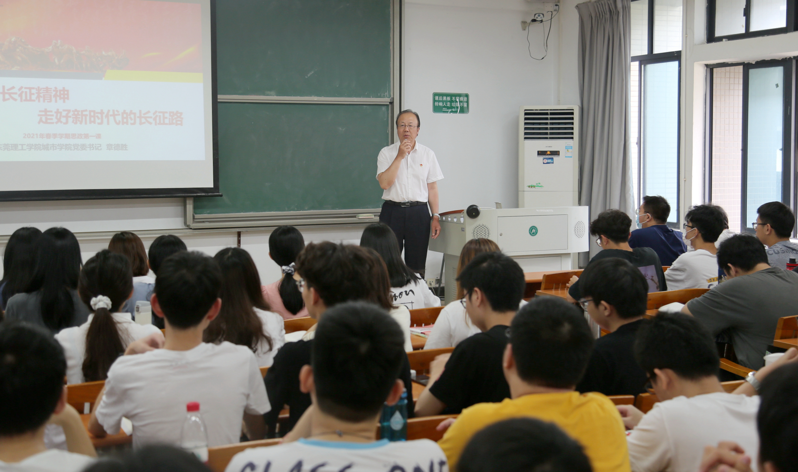 章德胜指出,长征是中华民族不屈不挠精神的典范。87年前,先辈们用生命和热血谱写了“惊天地、泣鬼神”的长征之歌。章德胜用生动的语言和饱满的情感,讲授了长征的发生原因、突出特点、发展历程、部队路径以及途中发生的著名历史事件,全方位概述了1934年到1936年,历经11省,行程2.5万里的漫漫长征这一历史事件全貌,带给同学们心灵上无比的震撼与感动。