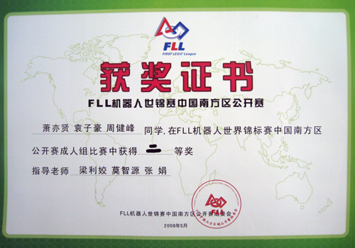 5月25日,首届FLL机器人世界锦标赛中国南方区公开赛在深圳会展中心举行。由我院梁利姣、张娟老师指导的计算机与信息科学系代表队(肖亦贤、袁子豪、周健峰同学组成)荣获二等奖。