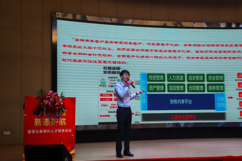 宋健副总裁介绍了新道产业学院的护航计划。新道教育以“教育新道”的教育理念,以“融合力量,实践育人”为核心,以IT信息技术为依托,以实践教学基地为基础,以“双师型”师资队伍为保障,努力投身于教育与信息化融合浪潮。新道将致力于打造全链教育服务生态,专注于教育体系高质量发展。形成教育服务链、企业服务链、专业集群链于一体的新道服务生态平台。