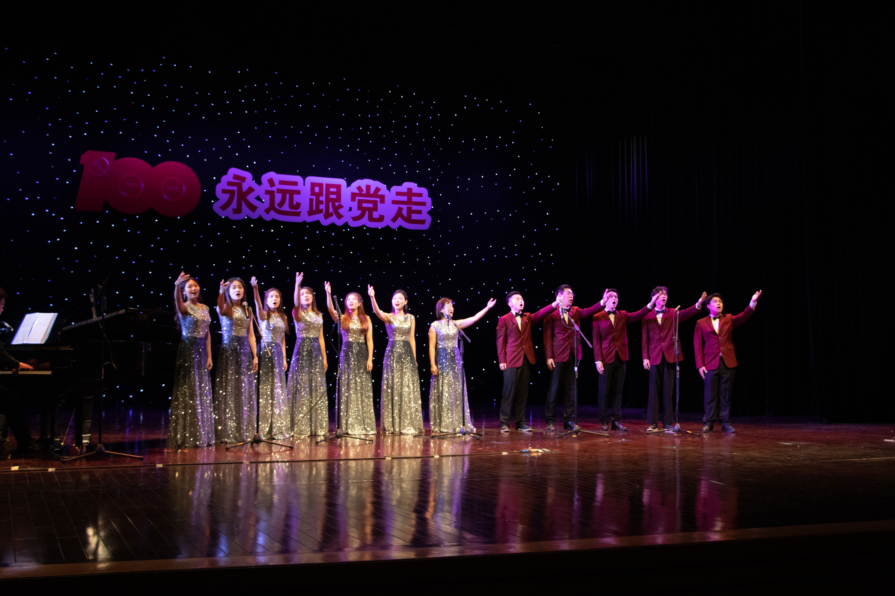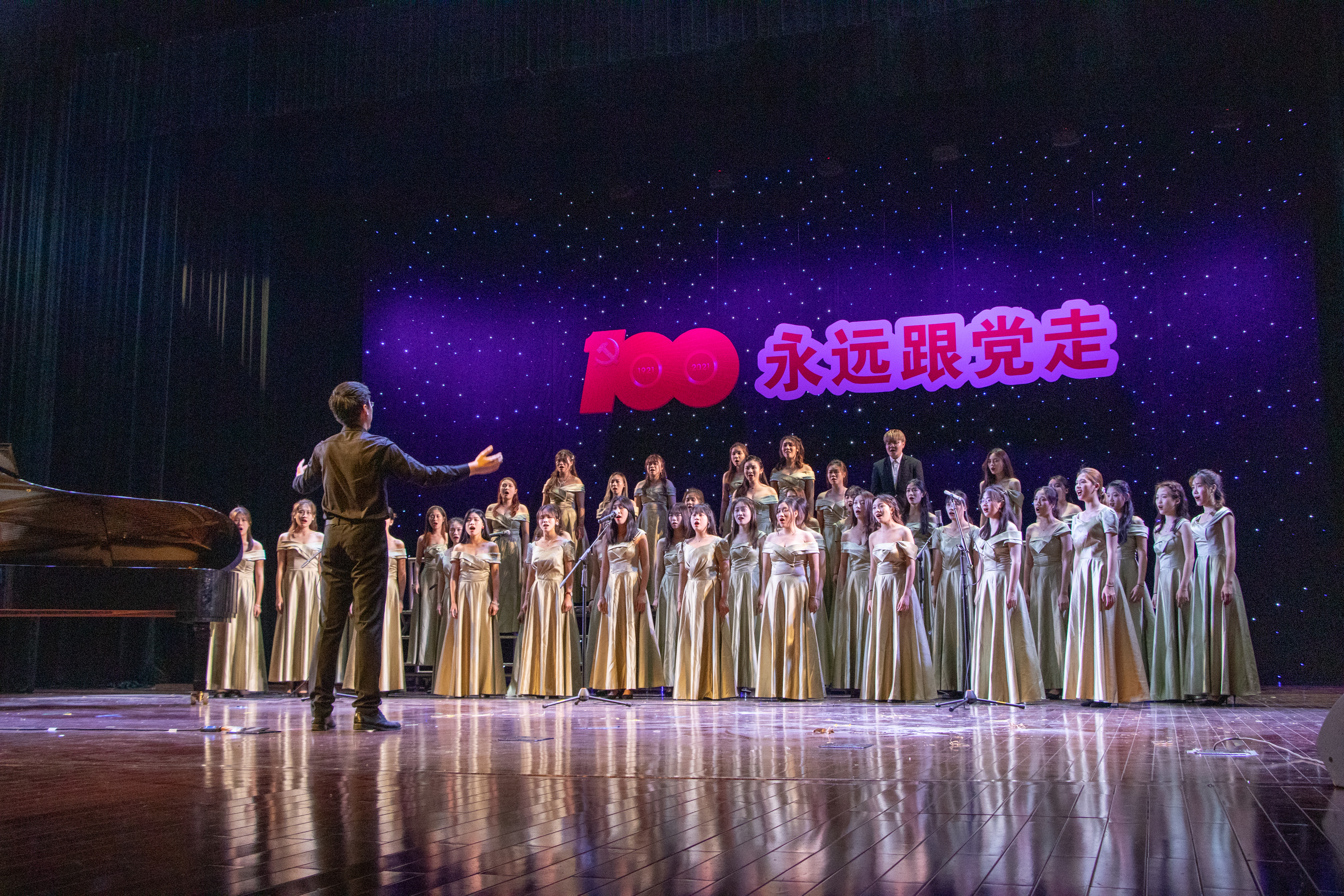 艺术学院一直秉承着教学与实践相结合的形式,院领导和专业负责人不断尝试走出教室,走上舞台,通过舞台实践来缩短课堂与舞台之间的距离,提高学生的综合素质,向社会展示教学成果。在建党百年华诞之际,艺术学院师生们用歌声表达对党的祝福,用舞姿跳出对美好生活的向往。通过最经典、最优秀的文艺作品,弘扬主旋律,凝聚正能量,唱出浓浓的爱党情、爱国情,向建党百年献礼。