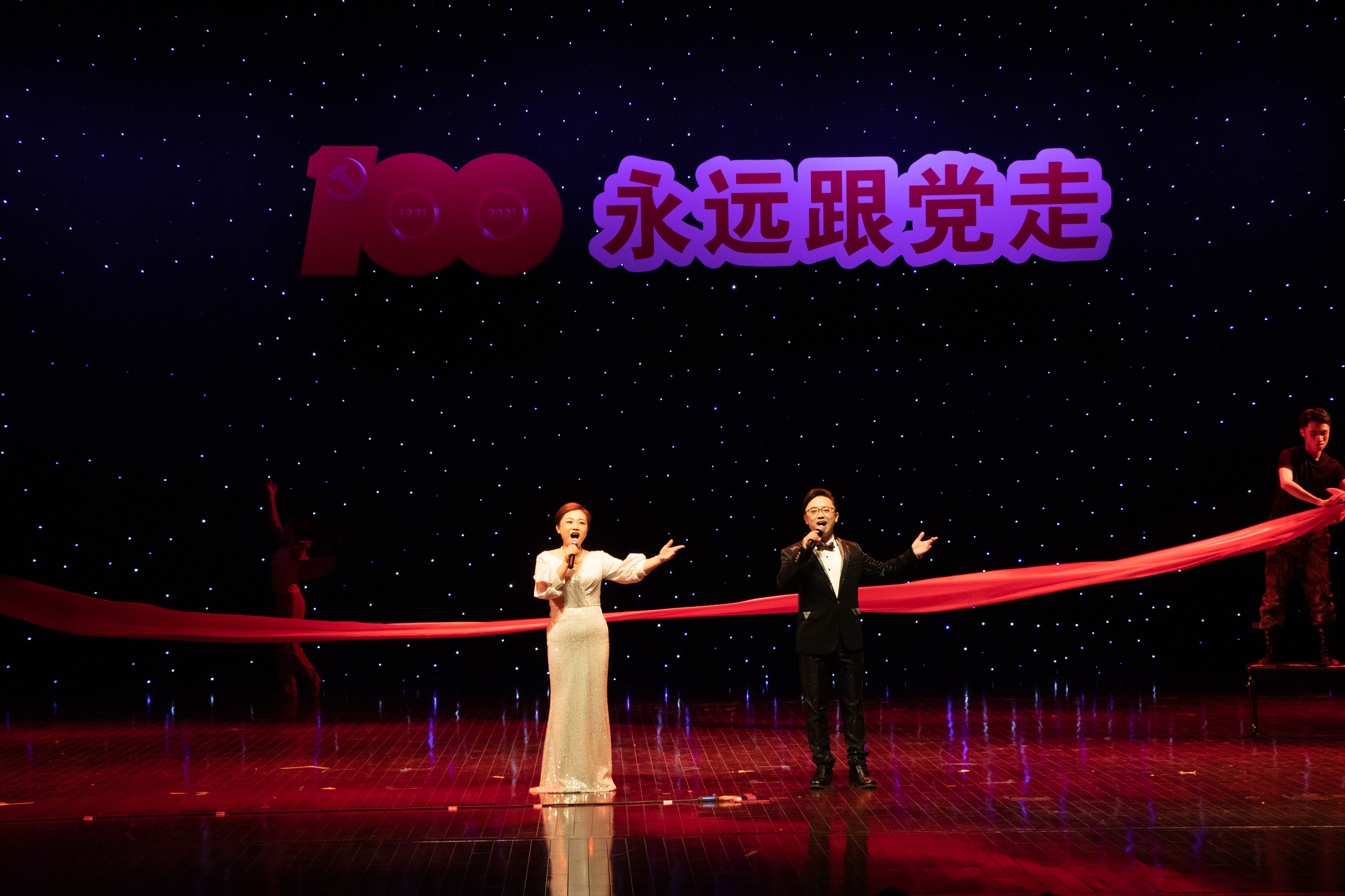 康慧丽、刘倩等4名老师带来的《跟你走》,通过悠扬的歌声,表达了人民像孩子一样,党像妈妈一样。牵着妈妈的手跟你走,歌颂了党在开辟的道路越走越宽广,每一名党员把眷恋的祖国装进心宇,以生命随党去万里远航。