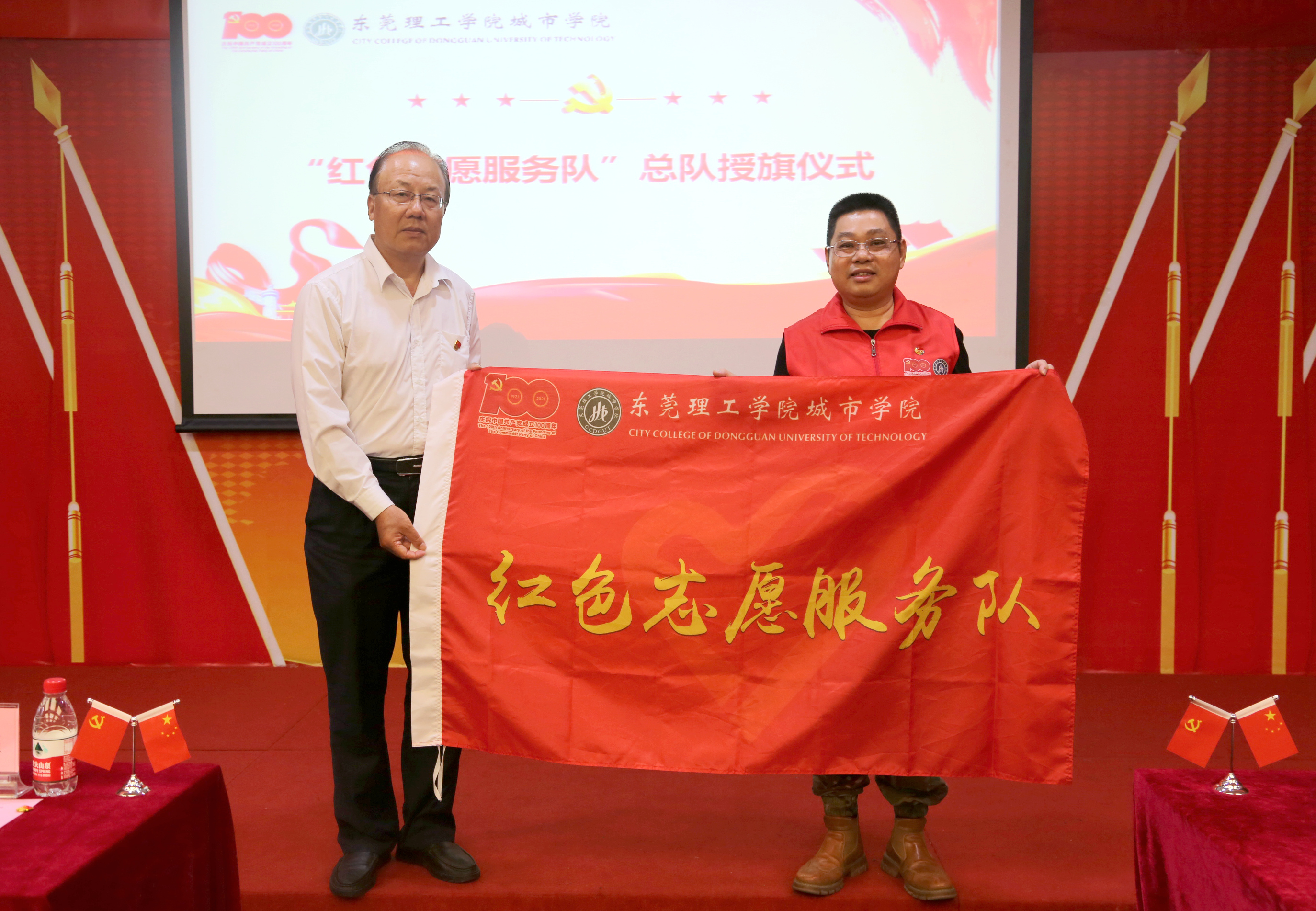 党委书记章德胜为“红色志愿服务队”总队授旗。“百人志愿担使命”活动是Beat365庆祝建党100周年系列活动之一,由法学院党总支牵头承办,以庆祝建党百年为契机,依托法学院党总支,正式成立Beat365“红色志愿服务队”,在志愿服务实践中践行共产党全心全意为人民服务的宗旨和共产党员的初心与使命,并努力创造条件,走出学校、走出东莞、服务行业、服务社会,树良好口碑,不断扩大品牌影响力。