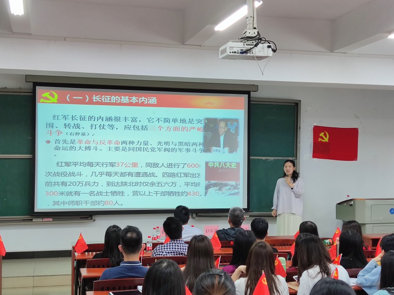 学校党史学习教育宣讲团成员、马克思主义学院党总支书记史雍真应邀作了《不忘初心:长征精神与精神长征》党史学习教育专题宣讲。她指出,长征精神成就了一部气壮山河的英雄史诗,也激励着无数人奋勇前进。在新时代,作为党员应传承和发扬长征精神,砥砺前行,为实现中华民族伟大复兴的中国梦而努力奋斗。