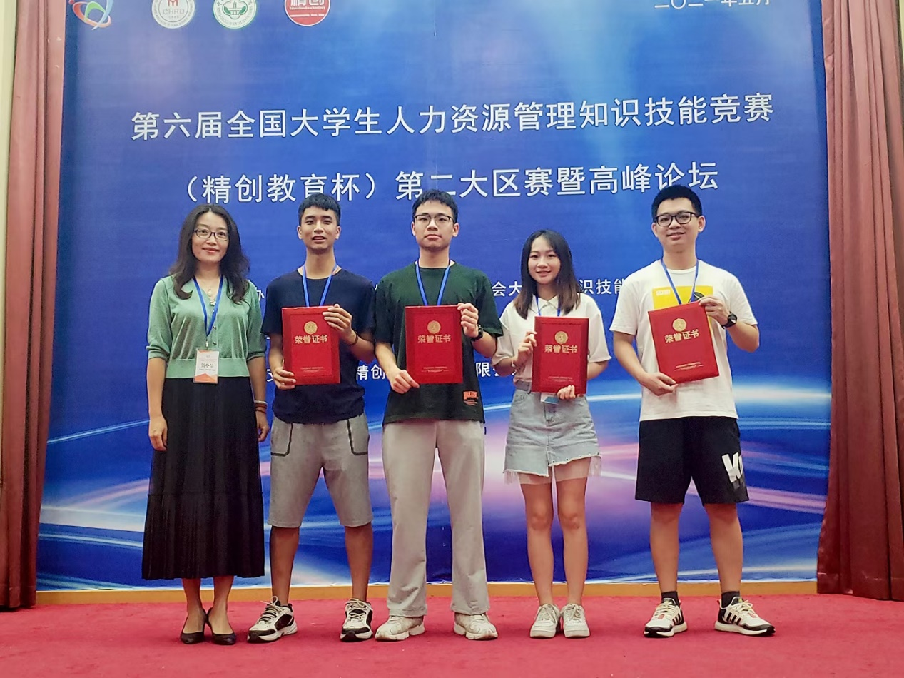 第六届全国大学生人力资源管理知识技能竞赛(精创教育杯)暨高峰论坛于2021年5月15日-16日在广州新华学院举办。来自广东、广西、湖南、海南等地的53所本科院校同台竞技,切磋交流。Beat365商学院2018级人力资源管理专业谢伟杰、吴佩卿、叶顺昌、林学彬4位同学在贺冬怡、李凌洁老师的带领下取得历史性突破,斩获大赛综合一等奖,理论知识考评一等奖,软件经营模拟二等奖。