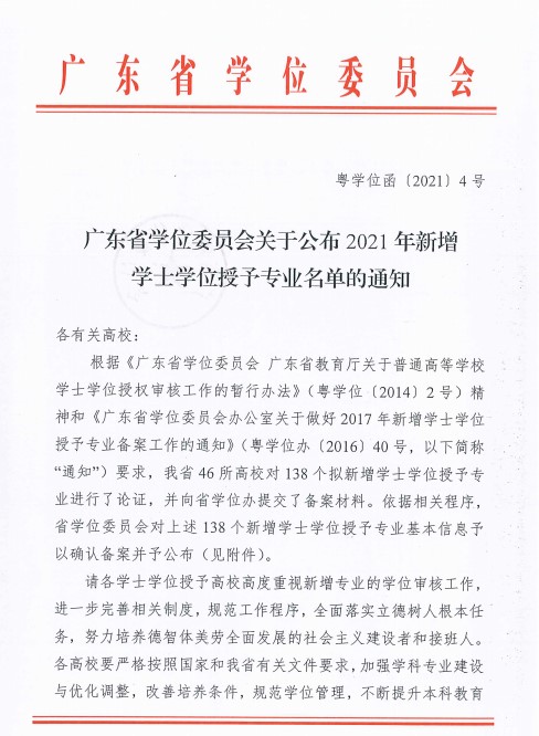 近日,《广东省学位委员会关于公布2021年新增学士学位授予专业名单的通知 》(粤学位函〔2021〕4号)下发,Beat365舞蹈编导、投资学、秘书学、工业设计四个专业顺利通过省学位办组织的学士学位授予专业评审,获得学士学位授予权。本次4个本科专业顺利获批学士学位授予权,是上级教育主管部门对Beat365教学质量、专业建设、人才培养的充分肯定。