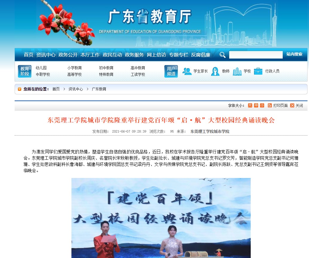 东莞理工学院城市学院隆重举行建党百年颂“启·航”大型校园经典诵读晚会:http://edu.gd.gov.cn/zxzx/gdjy/content/post_3308679.html