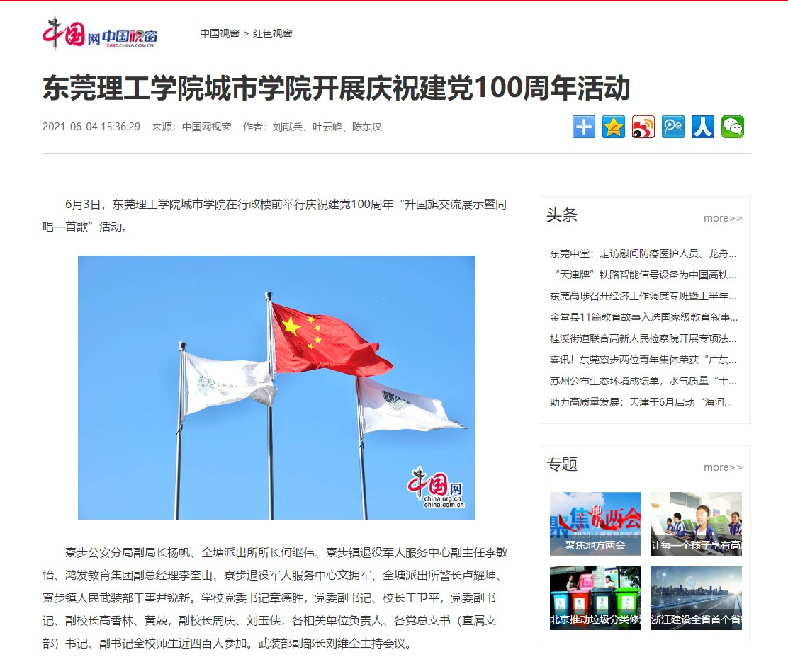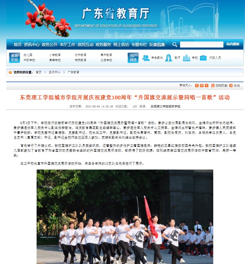 东莞理工学院城市学院开展庆祝建党100周年“升国旗交流展示暨同唱一首歌”活动:http://edu.gd.gov.cn/zxzx/gdjy/content/post_3307572.html